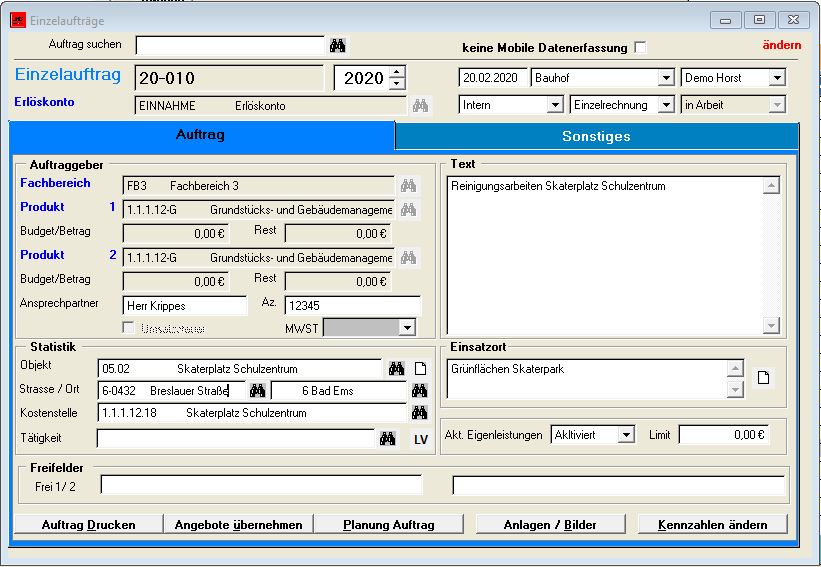 Bei der Auftragsanlage werden alle für die Abrechnung relevanten Kennzahlen (Doppik oder Kameral) wie Erlöskonten, Produkte, Kostenstellen, Kostenträger oder Haushaltsstellen zugeordnet.Es können unterschiedliche Abrechnungsvarianten eingestellt werden (Abrechnung nach internen und externen Sätzen, Abrechnung nach Angebotspreis). Entsprechend der bei der Auftragsanlage eingestellten Daten erfolgt die später die Leistungserfassung bzw. die Erstellung der Rechnung als Sammel- oder Einzelrechnung.Außerdem können weitere statistische Kennzeichen wie Tätigkeiten, Objekte, Ortsteile zugeordnet werden, die für Auswertungen zur Verfügung stehen. Für Asufträge oder Objekte können auch ein Leistungsverzeichnis erstellt werden.Der Zugriff auf Standardtextbausteine erleichtert die Auftragsanlage. Bei vielen Aufträgen können Einsatzort und Tätigkeit sofort zugeordnet werden. Nach der Anlage eines Auftrages kann direkt ein Einsatz- oder Rapportzettel für die Mitarbeiter gedruckt werden. Mit der Auftragsplanung kann direkt die Arbeitsvorbereitung durchgeführt werden. Die Bearbeitung der Aufträge, das Abfragen von Aufträgen erfolgt über eine komfortable Auftragsübersicht mit einfachen und schnellen Filterfunktionen.